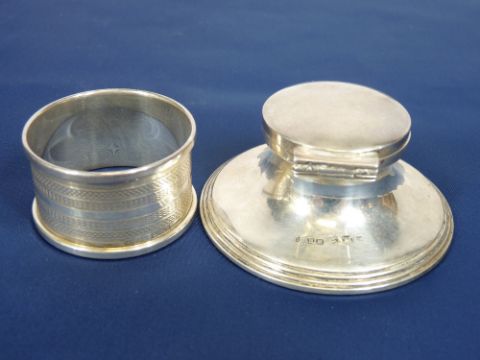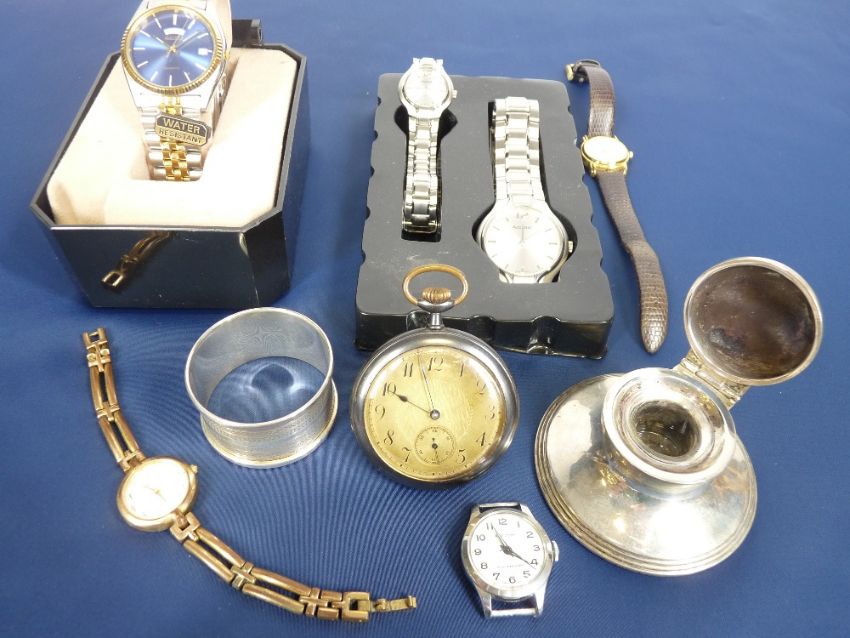 LADY'S & GENT'S WRISTWATCHES, reproduction pocket watch marked 'The Royal Mail Steam Packet' and two small silver items to include a Capstan style inkwell, Birmingham 1918, maker Henry Matthews, 6.75cms diameter the base and a napkin ring Birmingham 1961, maker Henry Griffith & Sons Ltd, the watches include a bi-colour Seiko Quartz with day and date apertures and an Accurist stainless steel lady's and gent's set, boxed