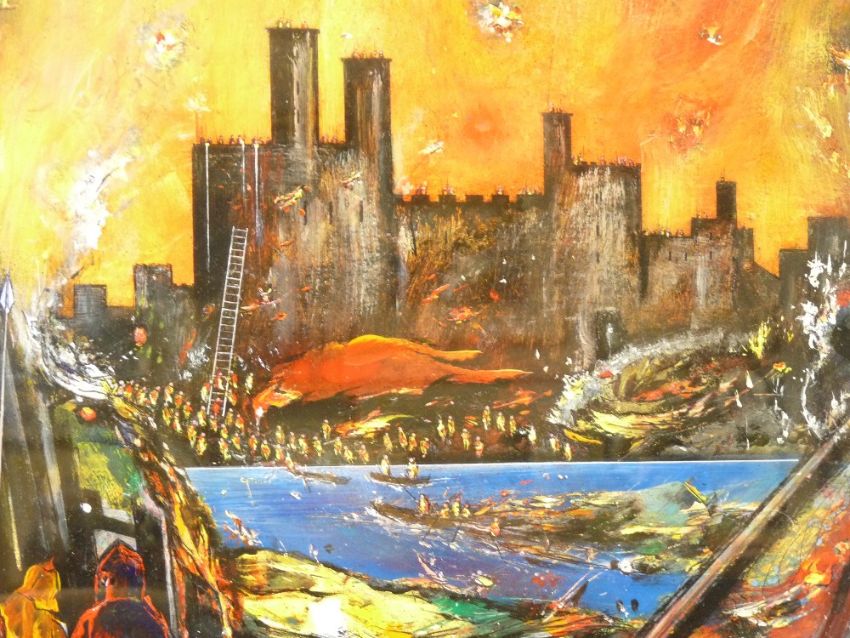 DAVID WILDE acrylic entitled - 'Siege of Caernarfon Castle by The Welsh' circa 1404, signed, 44 x 56cms PLEASE NOTE REVISED ESTIMATE