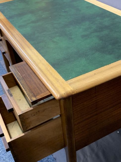 MID-CENTURY TEAK OFFICE DESK - with inset green leather top, central frieze drawer, twin pull-out trays over a left bank of three drawers and a right bank of two drawers on square supports, 74cms H, 152cms W, 83cms D