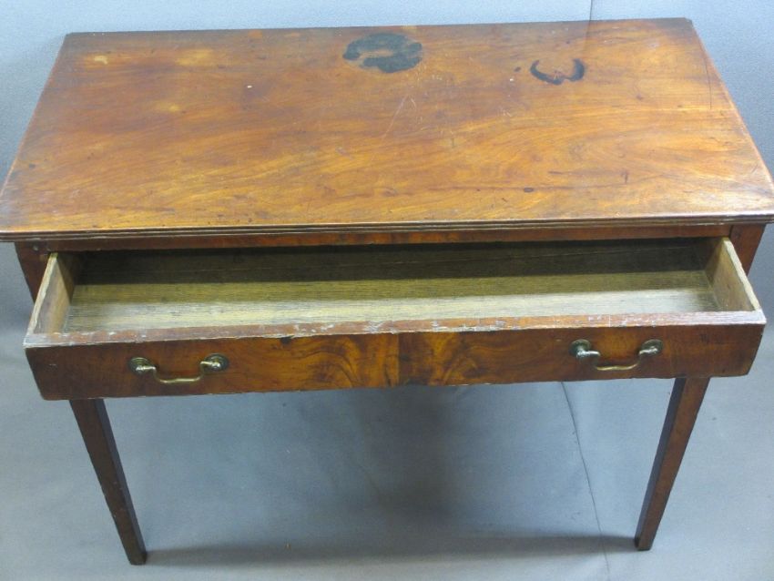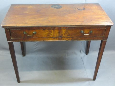 19TH CENTURY MAHOGANY SINGLE DRAWER WRITING TABLE - on tapered supports, 70cms H, 90cms W, 46cms D