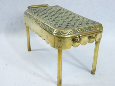 VINTAGE CAR MASCOT and a brass trivet stand having a pierced top and end carry handles, on tubular supports, 17cms H, 34.5cms W, 15cms D, a Vulcan blacksmith, early example head turned right, circa 1912 showing a blacksmith in standing pose next to his anvil, on a circular threaded cap, 13.5cms H