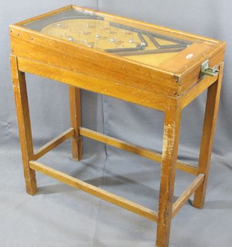 KUMBAKATEL VINTAGE PINBALL MACHINE on wooden stand, 89.5cms H maximum, 43cms W, 80.5cms L not including penny slot