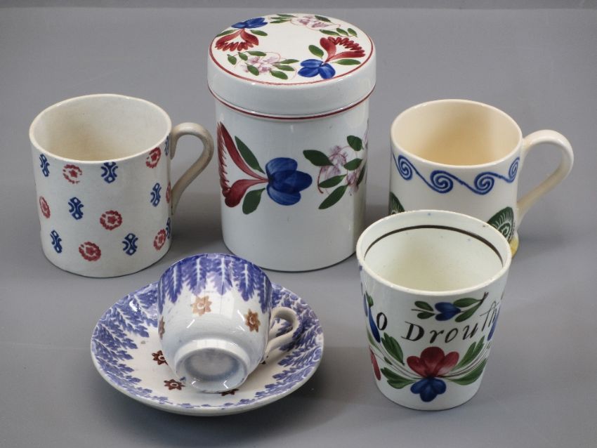 A T G GREEN FLORAL CIRCULAR LIDDED POT, a small tapered floral painted beaker - 'Old Drouth', two spongeware style mugs and a small early spongeware blue and white cup and saucer