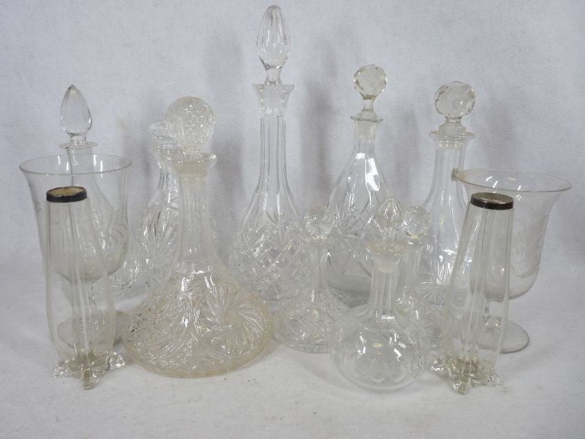 VICTORIAN & LATER GLASSWARE & DECANTERS, a quantity including two pedestal celery vases, two silver rimmed bud vases with cut glass and other decanters and stoppers