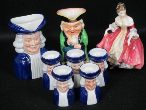 WOOD & SONS 'Ralph Enoch' Toby jugs, two Royal Doulton figurines 'Southern Belle' HN2229 and 'Michele' HN2234, Goebel model and other decorative china items