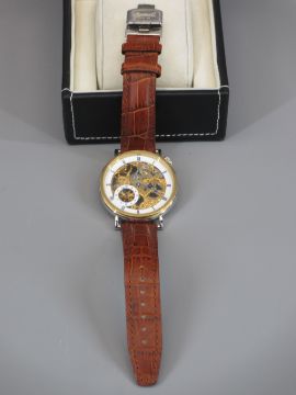 A CASED INGERSOLL CALIBRE 417 IN7900 MECHANICAL AUTO RESISTANT WRISTWATCH - cased, the yellow metal and stainless steel circular dial of 5cms, glazed back and front and with leather crocodile strap (little used)