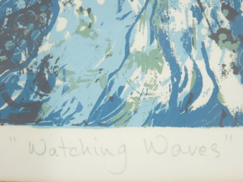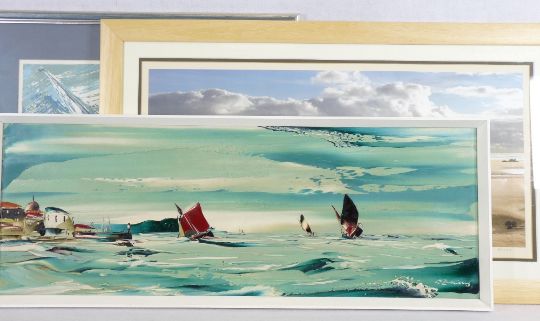 ERIC LEES photographic print titled 'Rock pools at Marloes Sands Pembrokeshire', OIL ON BOARD - stylised boats at sail and 'Watching waves', limited edition print (3/24), initialled E M - J M 85, 34 x 68cms, 29 x 82cms and 31 x 41.5cms measurements respectively