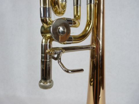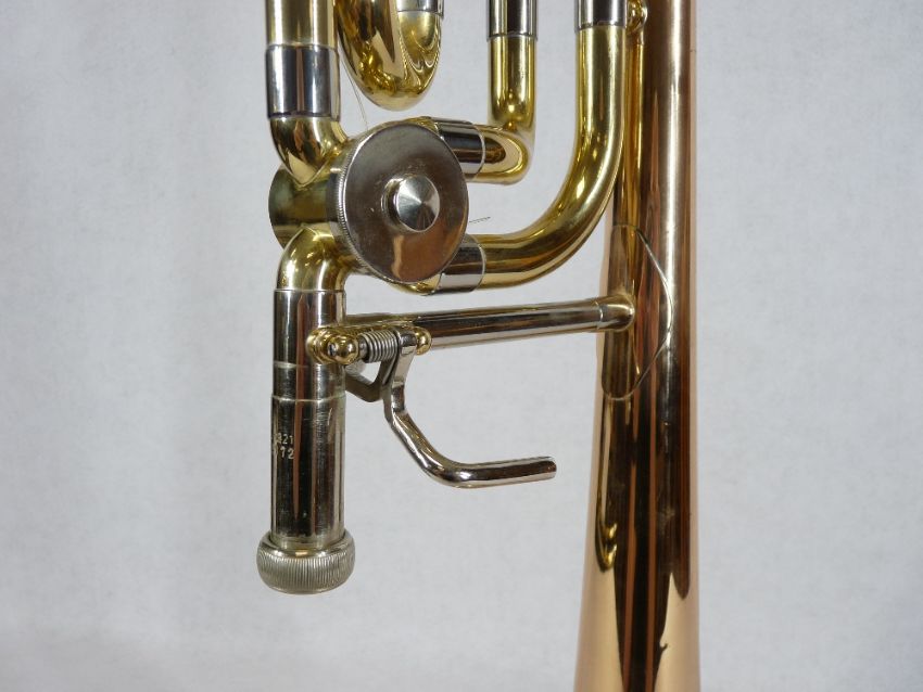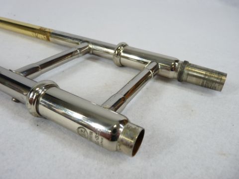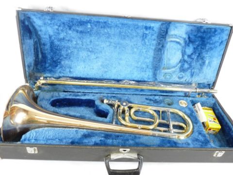 YAMAHA YBL-321 BASE TROMBONE - in fitted carry case, mixed polished metals with silvered mouthpiece, boxed Denis Wick trombone 3AL mouthpiece and other accessories, 112cms L overall, Serial Nos 410099 and 015172