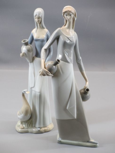 TALL NAO FIGURINE - a young woman with two water pitchers, 40cms H and another Spanish figure of a standing lady with pitcher and duck at feet, 35cms H