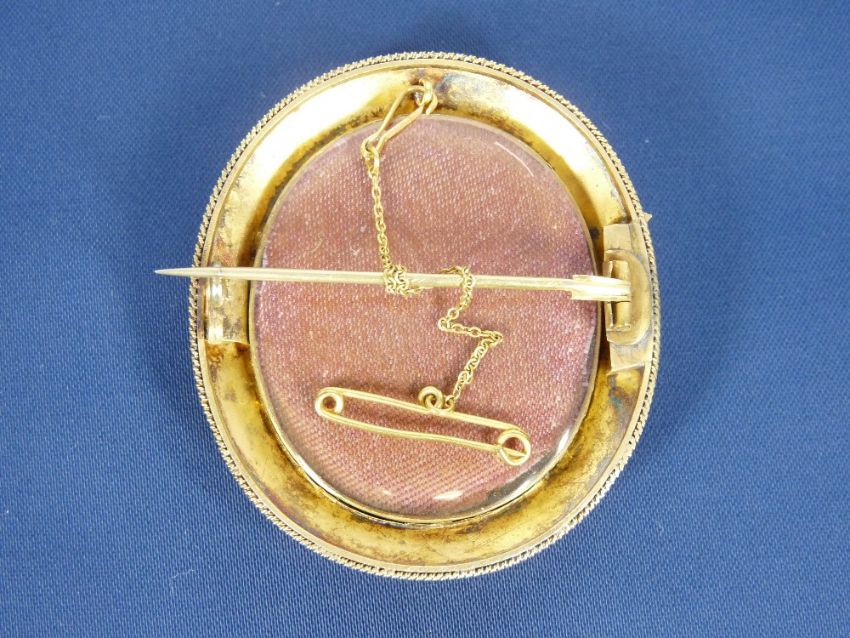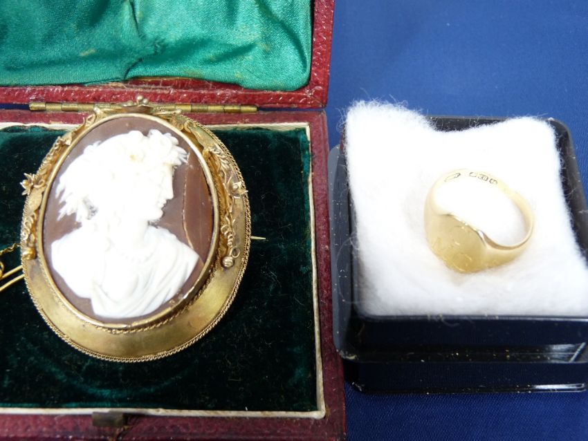 VICTORIAN & LATER JEWELLERY, 2 ITEMS - a cased pinchbeck framed cameo brooch, 15 x 4.5cms (AF) and an 18ct gold signet ring initialled 'C M G', size Mid P-Q, 6.5grms