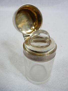 GEORGE III SILVER VINAIGRETTE, Birmingham 1787, maker T Simpson & Son, having chased foliate detail and vacant cartouche to the top (lacking interior grill), 3.75cms across and a silver topped smelling salts bottle, London 1891, maker probably George Wish