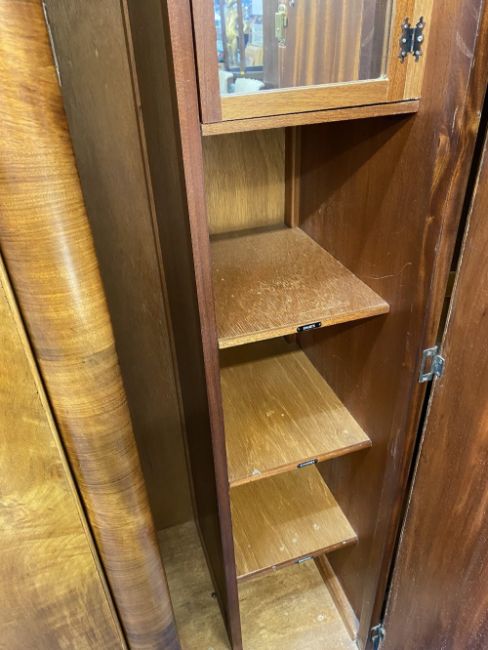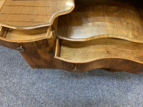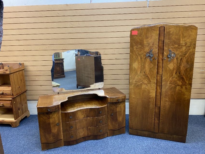 ART DECO STYLE WALNUT BEDROOM FURNITURE, 4 ITEMS to include a two door wardrobe, 72cms H, 83.5cms W, 47.5cms D, Serpentine front mirrored dressing chest, 136cms overall H, 129cms W, 51cms max D and two individual 4ft 6in headboards