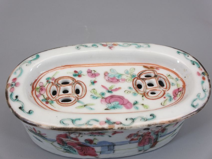 LATE 18TH/EARLY 19TH CENTURY OVAL FAMILLE ROSE POT - with pierced cover, 12 x 7cms having figural and floral decoration (slight chip to rim underneath at one end)