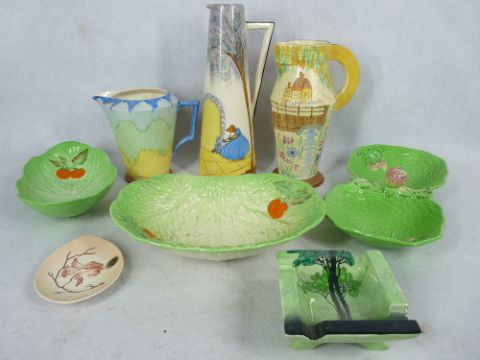 ART DECO POTTERY GROUP including a Flaxman ware, and other hand painted jugs, Carltonware Beswick dishes, ETC