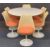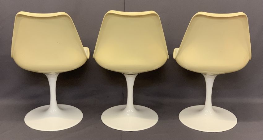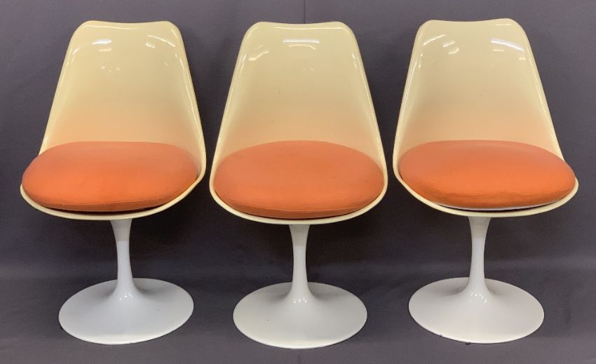 RUDI BONZANINI CIRCULAR PEDESTAL DINING TABLE & SIX CHAIRS - 73.5cms H, 120cms diameter and 79cms H, 50cms W, 44cms seat D, tulip type chairs and table, Retro design, the chairs with orange removable seat pads, the preformed seats have yellowed with age, table and chair bases with matching pedestal stems and circular bases, all stamped with designer's monogram circa 1960