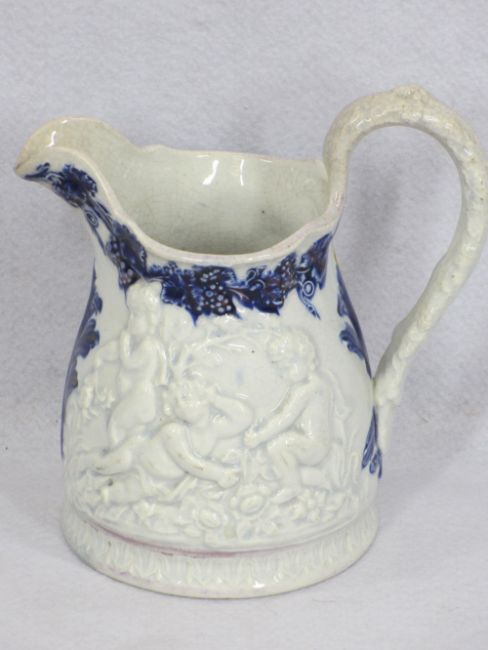 ROYAL DOULTON CHARACTER JUGS, Doulton Lambeth planter, Victorian and later jugs and a long handled copper warming pan, the character jugs include Toby Philpott large and small, Jester and Fat Boy, ANTIQUE JUGS (6) - transfer printed and in relief, the largest decorated with a Persian type scene with camel and people to the foreground, 28.5cms H, no maker's marks, two decorated with Oriental scenes, a pot flow blue and lustre example with cherubs in relief and two others, ANTIQUE PEARL WARE & OTHER BLUE & WHITE - a 20cms across pagoda with people on a bridge dish, pearl ware plate 25cms diameter, Oriental fence type pattern, flow blue jug with classical buildings and trees design, impressed 'South Wales Pottery' to the base, 14cms H, transfer decorated with pagodas jug marked 'W.T & Colandine' to the base, 17.5cms H, bullet shaped Dutch teapot and cover, 18cms across along with a large Copeland meat platter with transfer border in blue, 53.5 x 42.5cms, impressed and printed marks to the base and VICTORIAN COPPER LUSTRE WARE - 10 various jugs and a relief moulded teapot and cover, the jugs depicting ballet dancers, cherubs, hunt scenes, ETC, 19.5cms H the largest