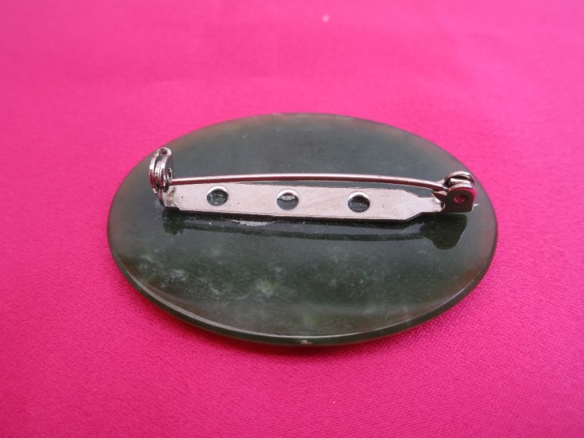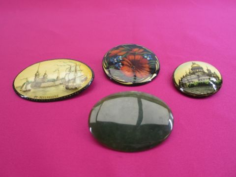 RUSSIAN BROOCHES (3) - hand painted, two city scapes, one floral and another brooch in green agate