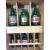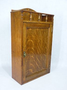 OAK MEDICINE BOTTLE CABINET containing eight green glass Latin labelled bottles, all having ribbed bodies and stoppers intact, 20cms H the tallest, 54cms H, 32cms W, 13.25cms D the cabinet