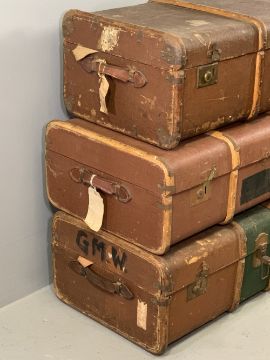VINTAGE TRUNKS (3), all wooden banded, 35cms H, 92cms W, 52cms D the largest