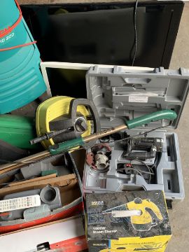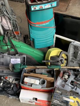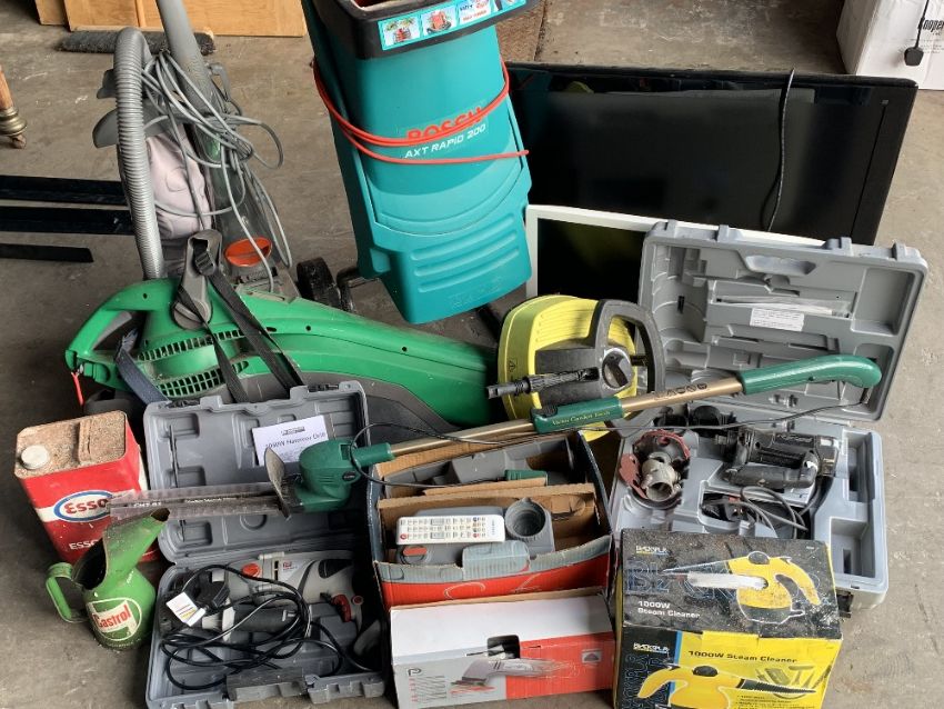 GARDEN, GARAGE & HOME ELECTRICS to include Bosch garden shredder, Samsung HD flatscreen tv, Kirby vacuum cleaner, cased power tools, ETC, E/T