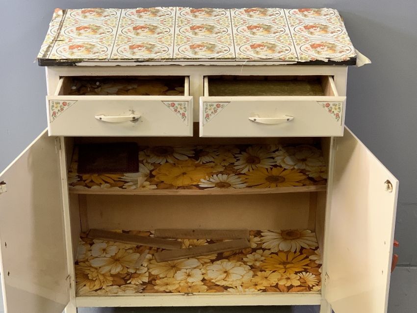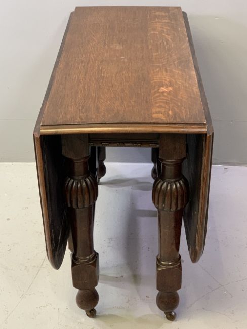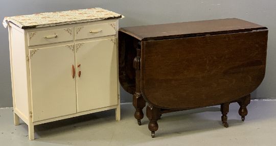 CIRCA 1950's KITCHEN CUPBOARD BASE, 84cms H, 77cms W, 38cms D and an antique oak gate leg table on turned supports, 76cms H, 105cms W, 150cms D