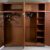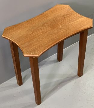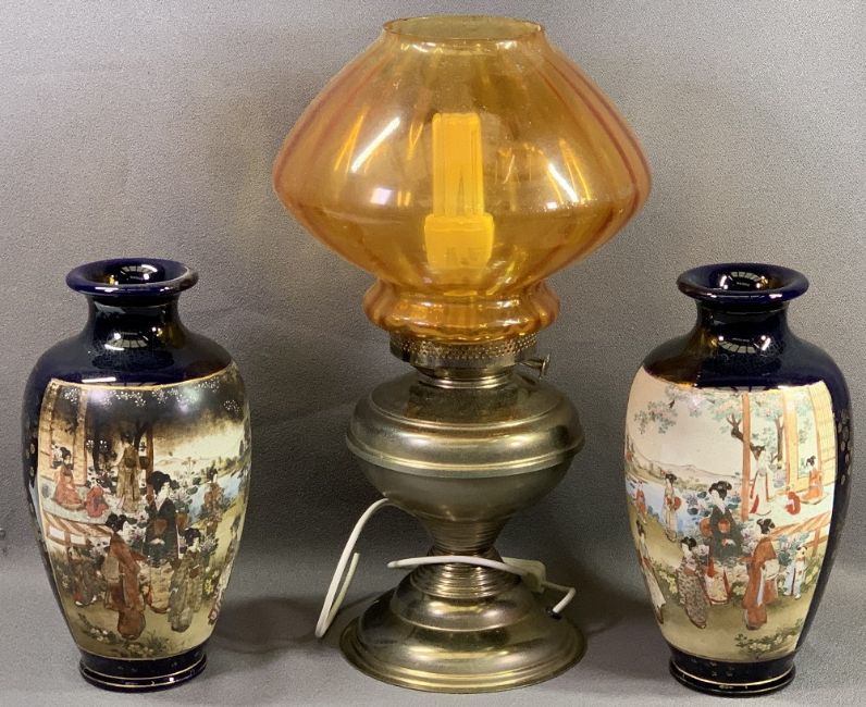 FURNITURE ASSORTMENT - polished drop leaf table, shaped occasional table, workbox/table, rustic oblong table, teak type bedroom furniture by Schreiber comprising pair of wardrobes and pair of bedside cabinets, vintage bevelled octagonal shaped mirror in an oak beadwork frame together with a pair of Satsuma vases and a brass based oil lamp with good amber glass shade