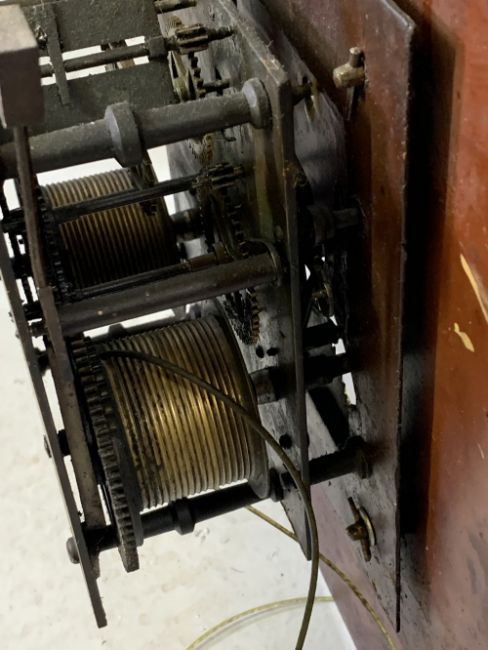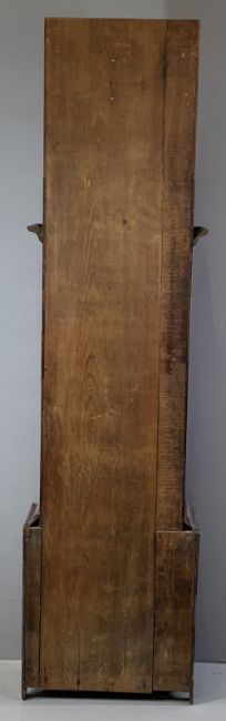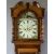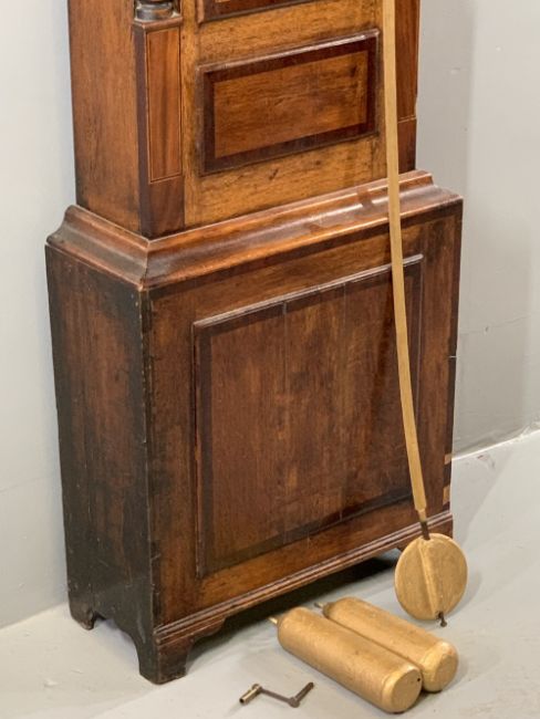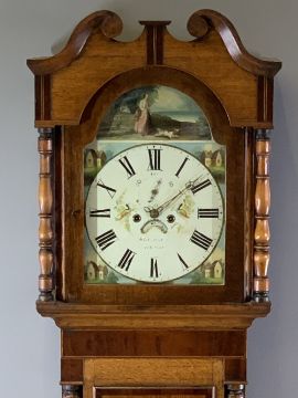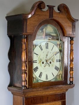 19th CENTURY OAK & MAHOGANY LONGCASE CLOCK by Williams of Bangor, painted arched top dial with cottage painted spandrels, the dial set with Roman numerals, subsidiary seconds dial and date aperture, before a pendulum driven twin weight bell strike movement (bell off, but present), the hood with broken swan neck pediment, single glazed door with flanking turned pillars over a short trunk door and half pillar detail, on a stepped base, the whole mainly oak with mahogany crossbanding, boxwood and ebony stringing, 215cms H, 57cms W