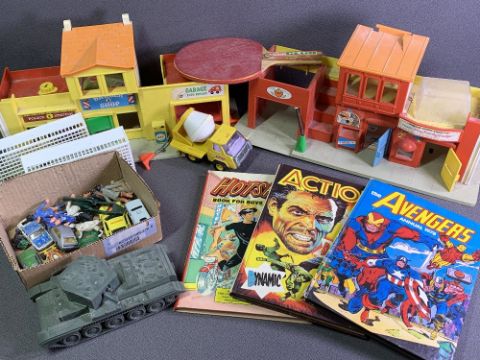 TOYS - Fisher Price 'Play Family Village Theatre', another building, quantity of diecast vehicles ETC