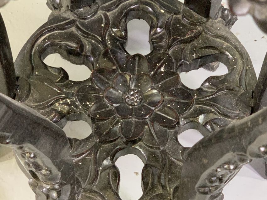 CHINESE CARVED HARDWOOD STAND with inset marble top, hexagonal top detail over six floriate carved supports and lower circular conjoining shelf, 81cms H, 46cms W, 46cms D, the top measuring 27 x 27cms