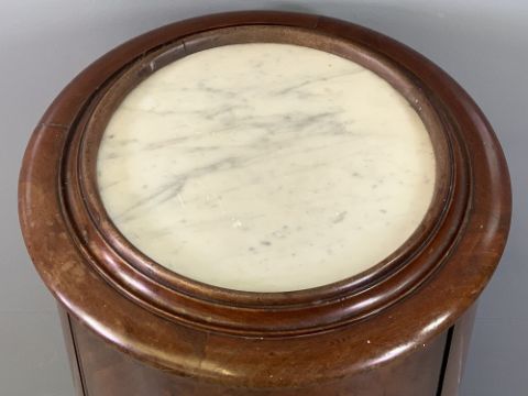 VICTORIAN MAHOGANY CYLINDRICAL POT CUPBOARD with single door and interior shelving, the top inset with circular white marble, 79cms H, 40cms diameter