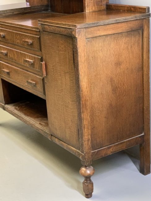 EDWARDIAN SIDEBOARD with domed top central rack, three drawers and two doors to the front, on turned and block supports, 140cms H, 144cms W, 46cms D