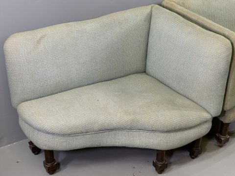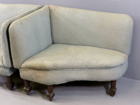 VINTAGE SINGLE SEAT CORNER SETTEES, a pair, on turned and block supports, 74cms H, 93cms W, 67cms D each