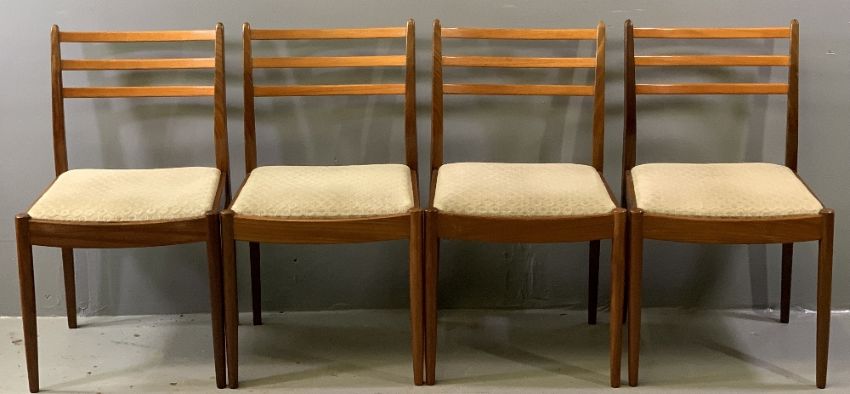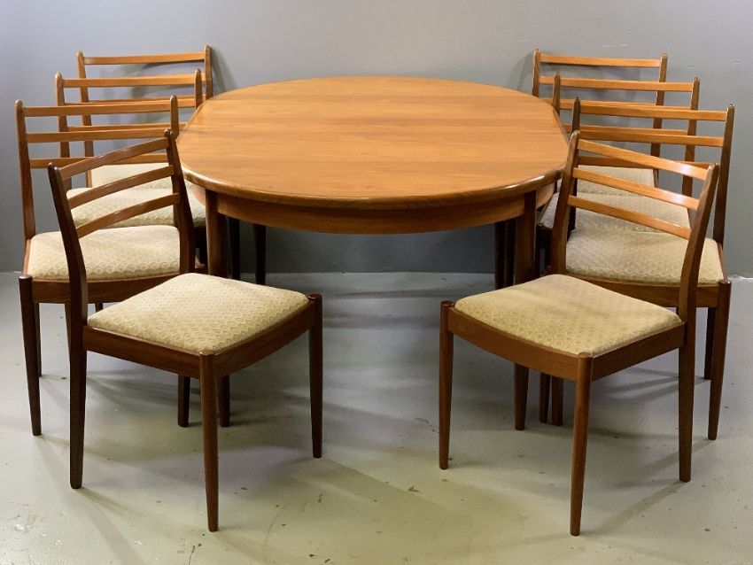 G-PLAN DINING TABLE & SIX CHAIRS - teak, extending, mid-Century style (table - 74cms H, 112cms W, 162cms L), (chairs - 83cms H, 49cms W, 38cms D the seat)