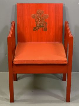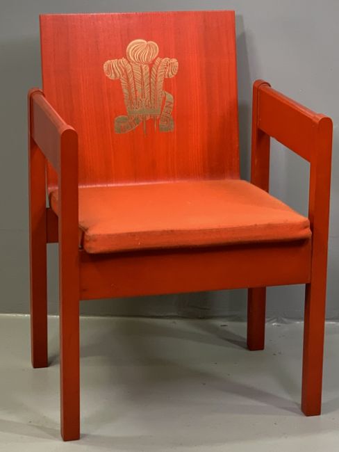 PRINCE OF WALES CAERNARFON INVESTITURE CHAIR, 1969, designed by Lord Snowdon and manufactured by Welsh Remploy Factories, in stained beech and plywood with olive ash, embossed with Prince of Wales feather motif in gold leaf, 78cms H, 54cms W, 47cms D the seat