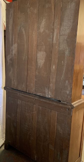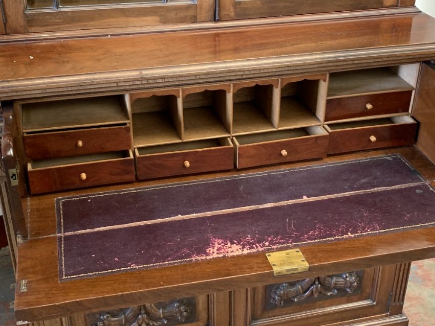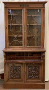SECRETAIRE BOOKCASE - antique mahogany with two carved doors to the base and glazed astragal pane twin doors to the upper with adjustable shelves, 225cms H, 120cms W, 50cms D