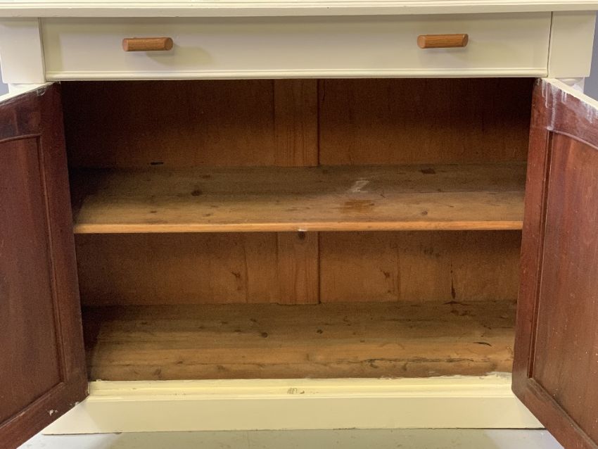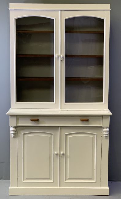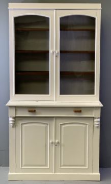 CWPWRDD GWYDR - painted white with twin upper glazed doors, single drawer and fielded panelled base doors, 210cms H, 112cms W, 45cms D