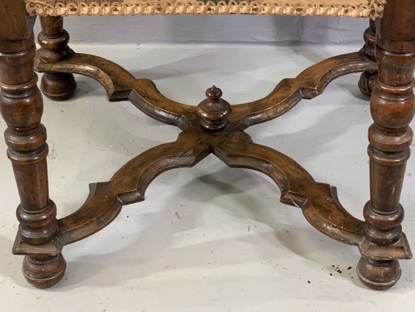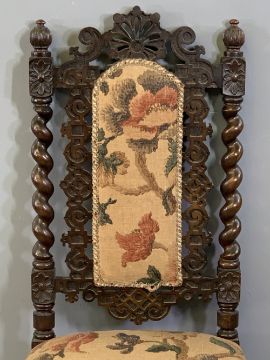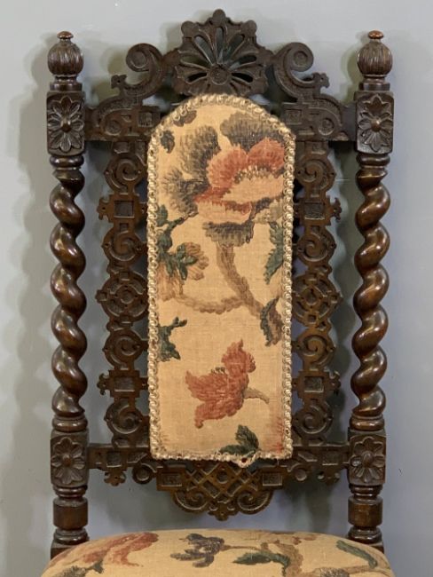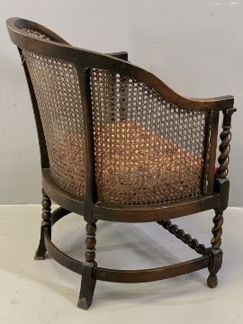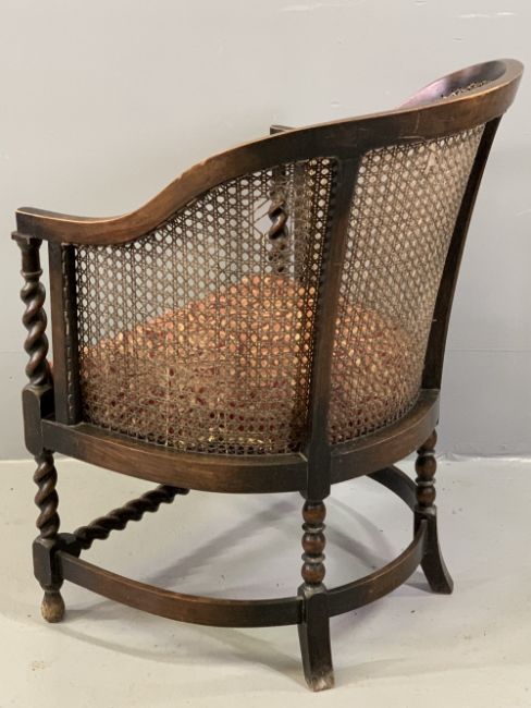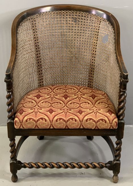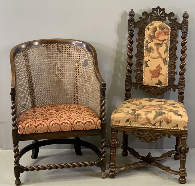 OAK OCCASIONAL CHAIRS (2) to include a carved oak Carolean style side chair with upholstered seat and back, on turned and block supports and 'X' frame stretcher, 111cms H, 50cms W, 39cms D the seat and a Bergere style cane back armchair on barley twist front supports with upholstered drop-in seat pad, 87cms H, 61cms W, 46cms D the seat