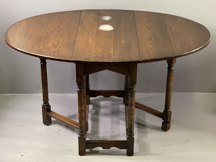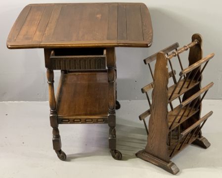 FURNITURE ASSORTMENT - oak gate leg table on turned and block supports, 73cms H, 41cms W (closed), 90cms D, 130cms W (open), a linenfold polished tea trolley with end drawer, three tier polished magazine rack and a brass topped occasional table