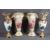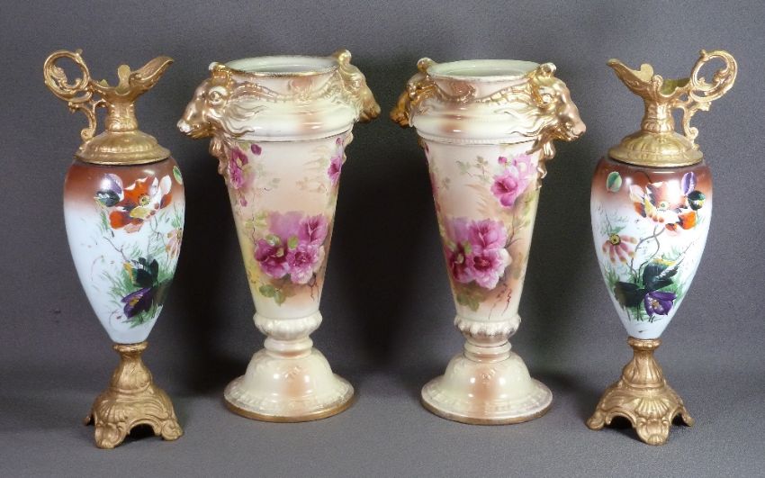 MILK GLASS & METAL EWERS - floral decorated, a pair, 41cms tall and a pair of floral decorated Staffordshire vases, 39.5cms tall