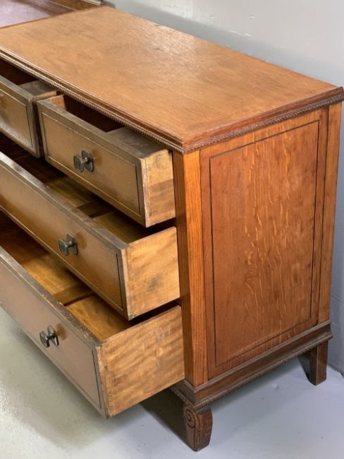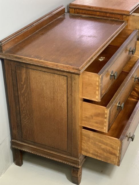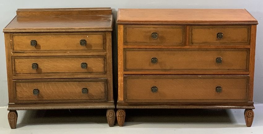 BEDROOM FURNITURE - neat matching Edwardian chests of drawers having beadwork detail with carved and shaped feet, two small over two long drawers and the other three drawers with railback, 81cms H, 101cms W, 44cms D and 82cms H, 79cms W, 46cms D