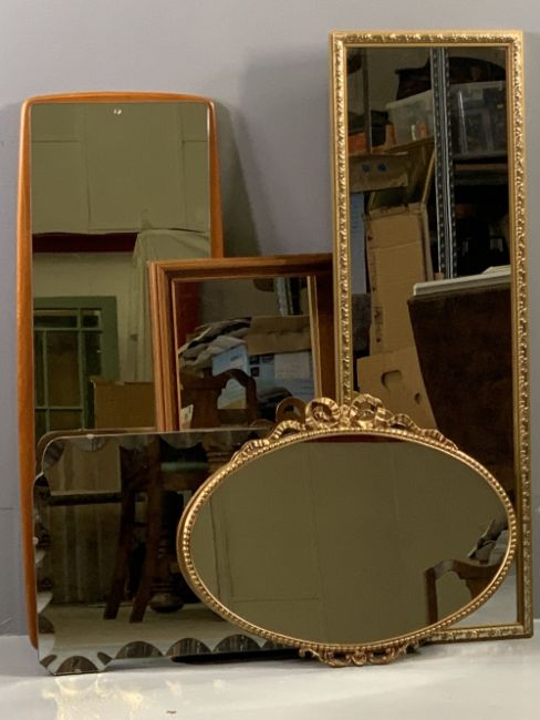 ANTIQUE MAHOGANY DINING CHAIRS - set of four with fretwork backs and red upholstered pad seats, also loom type tub chair and three other assorted vintage chairs together with five decorative and dressing mirrors, various sizes