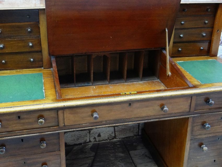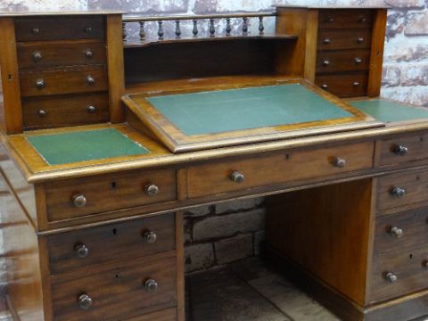 VICTORIAN MAHOGANY PEDESTAL DESK, angled fall between shelved superstructure and gallery, above twin pedestals of three drawers each, two frieze drawers flanking a central dummy, casters, 113h x 151w x 69cms