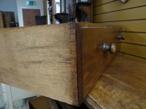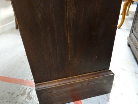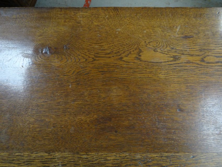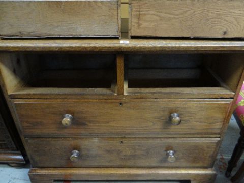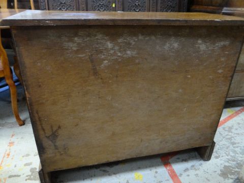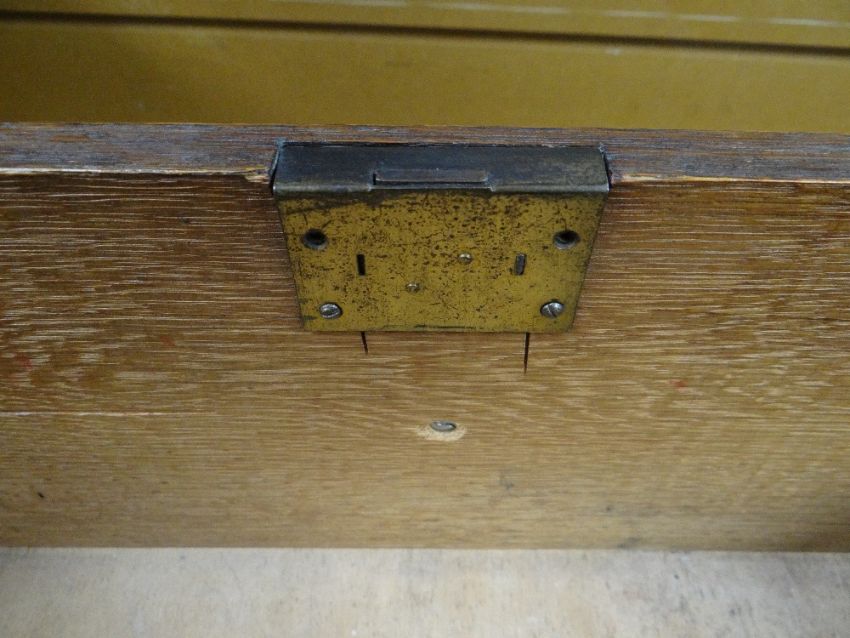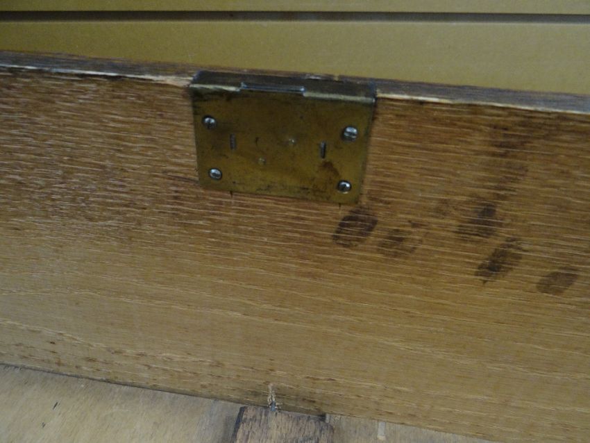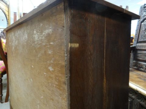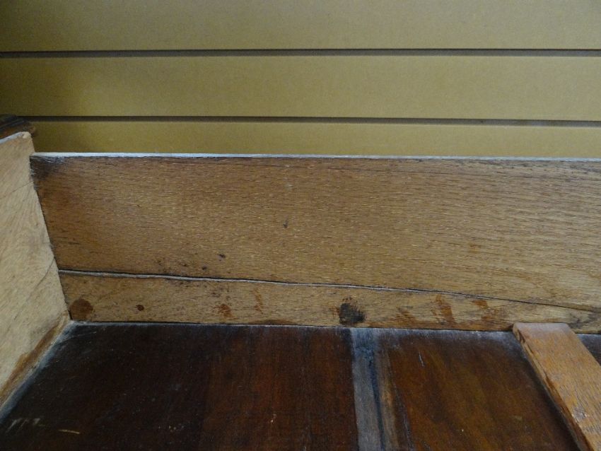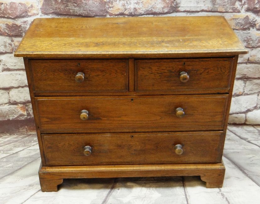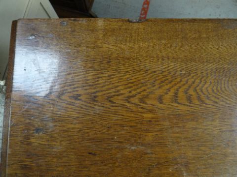 VINTAGE OAK FOUR-DRAWER CHEST, 107 x 45 x 89cms, together with VINTAGE CHILD'S BUREAU & CHAIR, 68 x 39 x 87cms (3)Regarding the chest of drawers.The drawers do feel a little stiff but all open and close well, all sit nice and flushThe bottom drawer’s base looks stained, not sure why, there is also a split in the back but is together and feels good.All handles and locks look good but missing key.Looking at the top, there is a ‘clean’ split, it does come apart when lifting. It could easily be re-glued and you would never tell. Light surface scratches, no real issues.All corners look good.Feet look good, no damage, stands well, no rocking.No worm anywhere.There is also a split on the one side, looks like it has been previously re-glued, needs a little filler and sanding, does not really affect the drawers. The other side looks good.All keyholes have their brass inserts.Sits on fixed plinth, all feet look good.