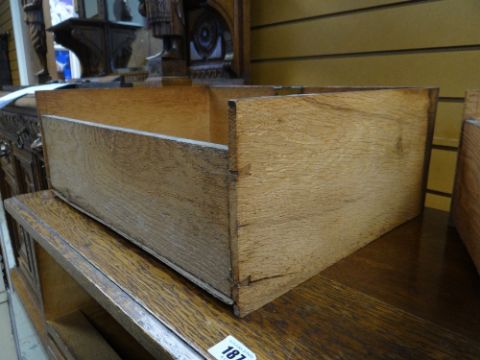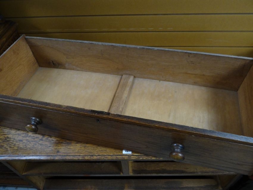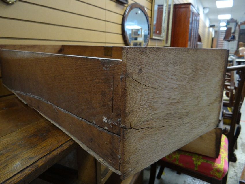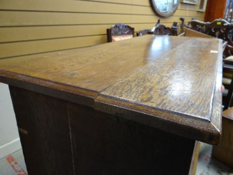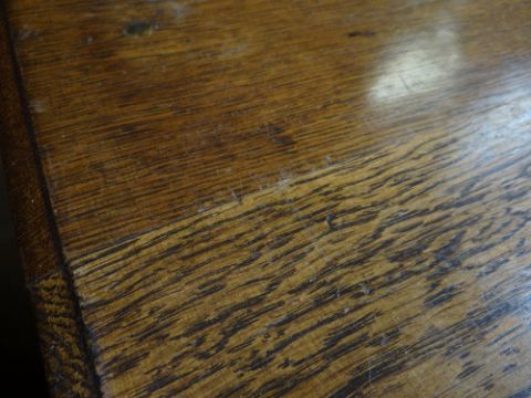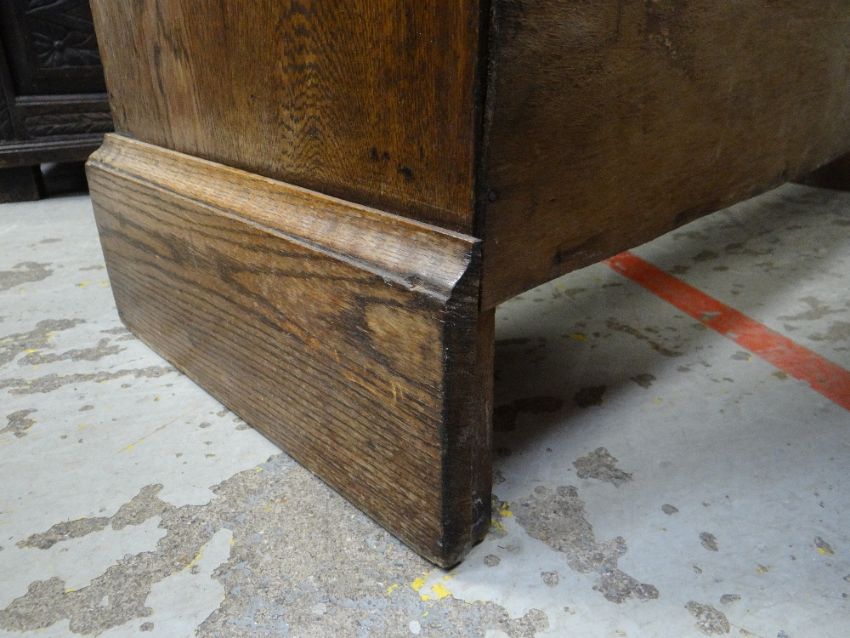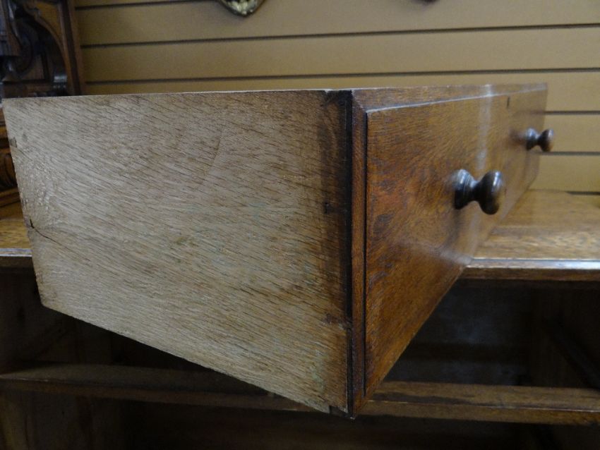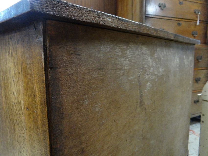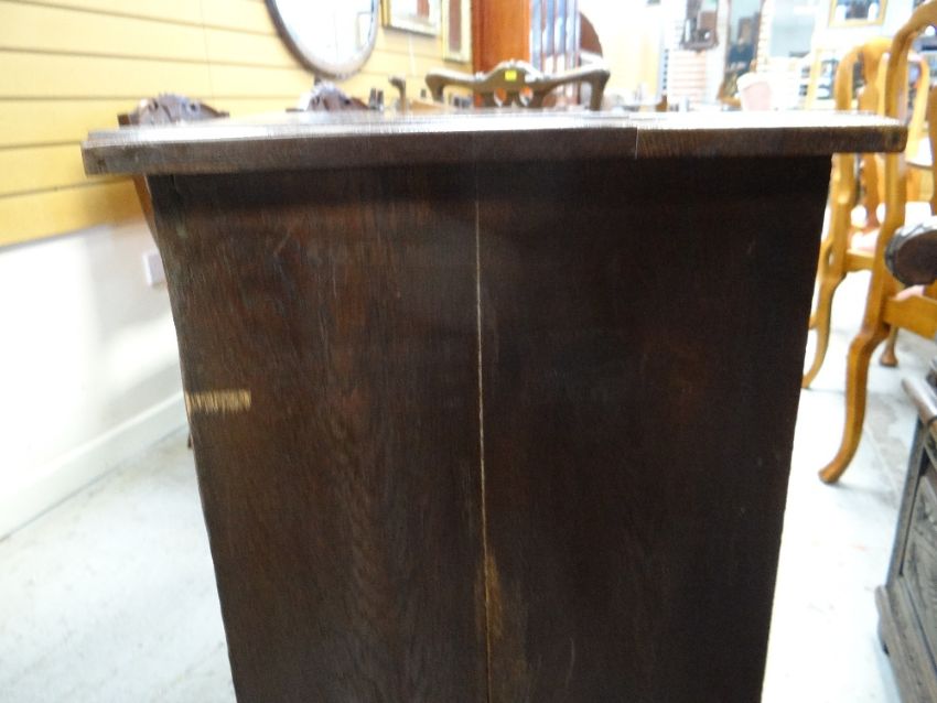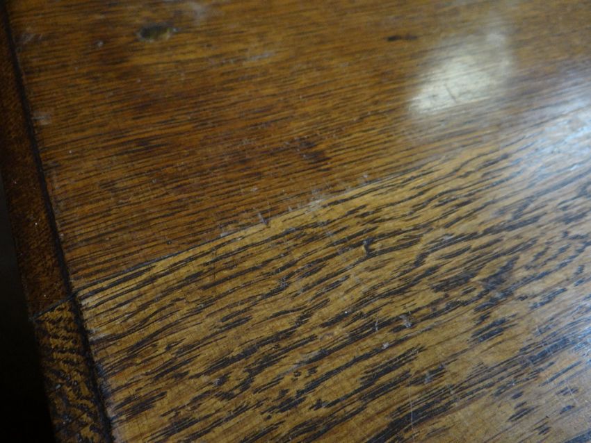 VINTAGE OAK FOUR-DRAWER CHEST, 107 x 45 x 89cms, together with VINTAGE CHILD'S BUREAU & CHAIR, 68 x 39 x 87cms (3)Regarding the chest of drawers.The drawers do feel a little stiff but all open and close well, all sit nice and flushThe bottom drawer’s base looks stained, not sure why, there is also a split in the back but is together and feels good.All handles and locks look good but missing key.Looking at the top, there is a ‘clean’ split, it does come apart when lifting. It could easily be re-glued and you would never tell. Light surface scratches, no real issues.All corners look good.Feet look good, no damage, stands well, no rocking.No worm anywhere.There is also a split on the one side, looks like it has been previously re-glued, needs a little filler and sanding, does not really affect the drawers. The other side looks good.All keyholes have their brass inserts.Sits on fixed plinth, all feet look good.