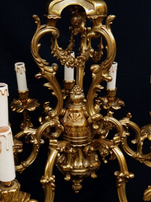 MODERN ITALIAN ROCOCO NINE-LIGHT BRASS CEILING LIGHT, triple acanthus scroll and floral swag centre, foliate S shaped arms and sconces, 74cms high x 70cms diameter