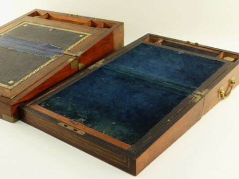 Condition: some corner veneers missing, one partially cracked lid, interiors incomplete/replace inkwells, repaired leather