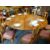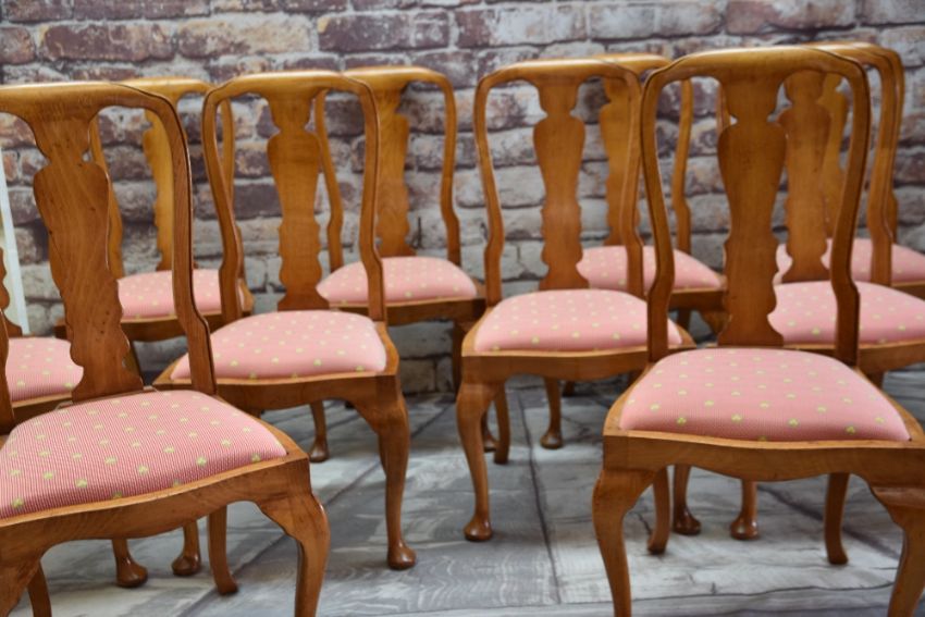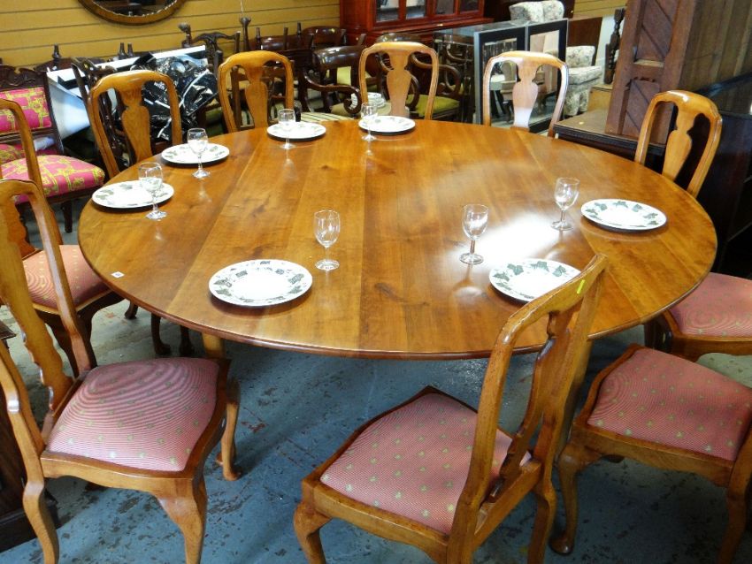 LARGE MODERN FRUITWOOD CIRCULAR DINING TABLE & SET TEN BEECH DINING CHAIRS, table with cabriole legs and pad feet, 213cms diam., chairs in the Queen Anne-style with red drop in seats (11)
