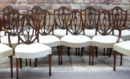 GOOD SET OF FOURTEEN 20TH CENTURY SHIELD-BACK DINING CHAIRS, with fan, acanthus and sunflower pierced backs, tapering serpentine stuff-over seats and tapering square section legs (12+2)