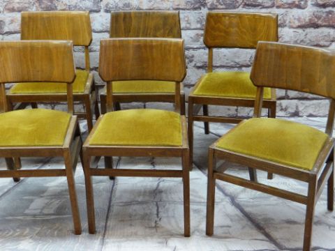 BEN OF FROME: EIGHT MID-CENTURY STAINED BEECH LOUNGE CHAIRS, with bent plywood tablet backs, mustard velour padded seats (8)