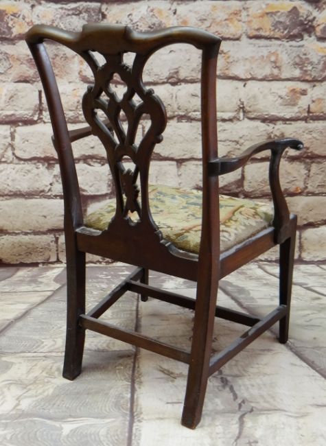 CHIPPENDALE-STYLE CARVED MAHOGANY CHILD'S ARMCHAIR, pierced and carved splat, needlepoint embroidered tapering square seat, scroll carved arms, tapering square section legs, H stretcher, 80cms high
